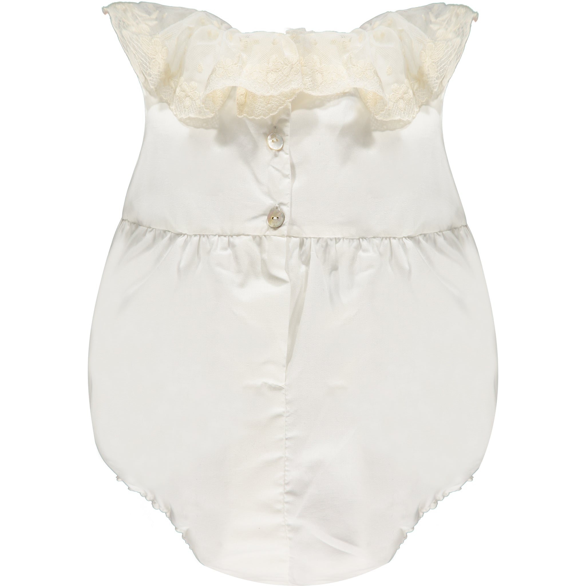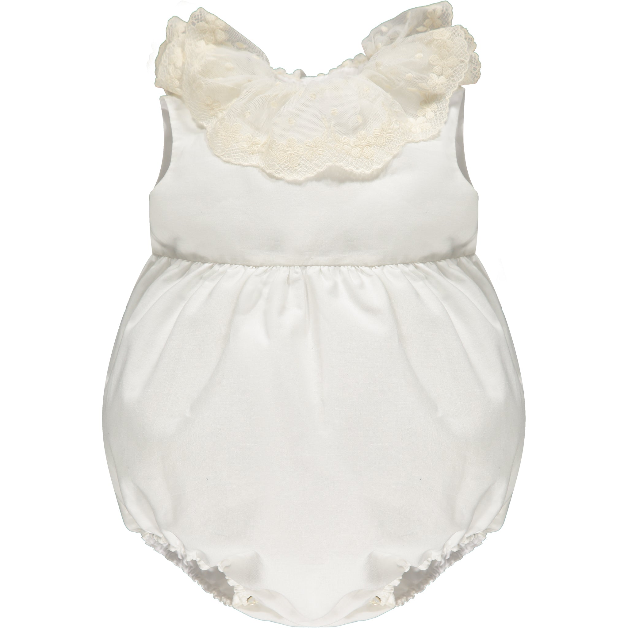 Off white cotton romper with a stunning embroidered tule collar